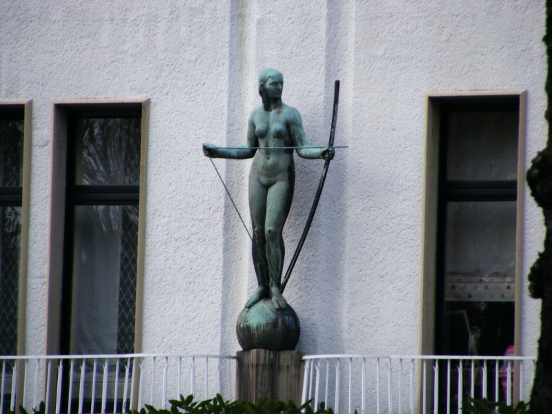 Eine Diana-Figur vor einem Haus am Bochumer Stadtpark.