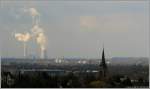 Mülheim an der Ruhr - Blick vom Bismarckturm. Am Bildrand links zeigt der Spitzturm den Standpunkt der Neuen Mitte Broich. In der Mitte die Aspera Bierbrauerei im Rhein-Ruhr-Hafen Mülheim (Entfernung 4 km). Direkt dahinter die Industrieanlagen von Duisburg, links sind die Kamine der Carbonario Kokerei in Duisburg Schwelgern zu sehen (Entfernung ca. 14 km). Hinter der Malzfabrik die Baustelle Block 10 des Kraftwerks Walsum (Entfernung ca. 17 km). Marina Frintrop