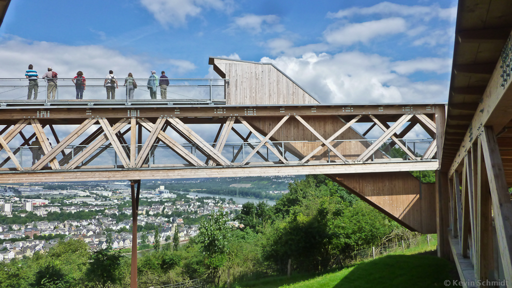Besucher des Koblenzer BUGA-Geländes genießen den Blick von der hölzernen Aussichtsplattform über die Stadt. (22.07.2012)