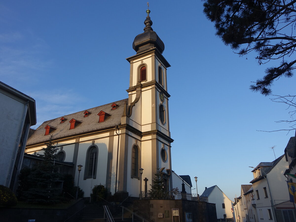 Saffig, Pfarrkirche St. Cäcilia, erbaut von 1738 bis 1748 nach Plänen von Balthasar Neumann, moderner Anbau von 1958 bis 1960 (26.12.2025)
