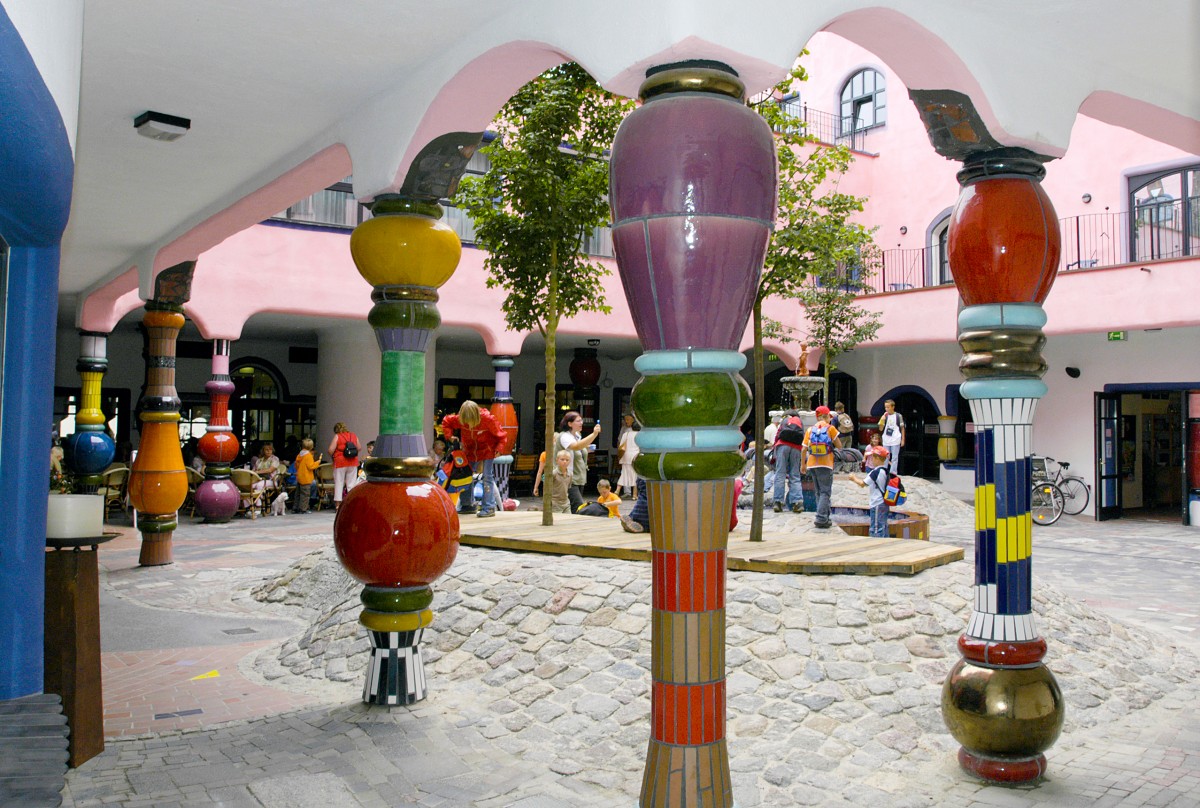 Der Innenhof der Grünen Zitadelle in Magdeburg - das letzte Projekt des österreichischen Künstlers Friedrich Stowasser, besser bekannt als Friedensreich Hundertwasser. Aufnahme: Juli 2006.
