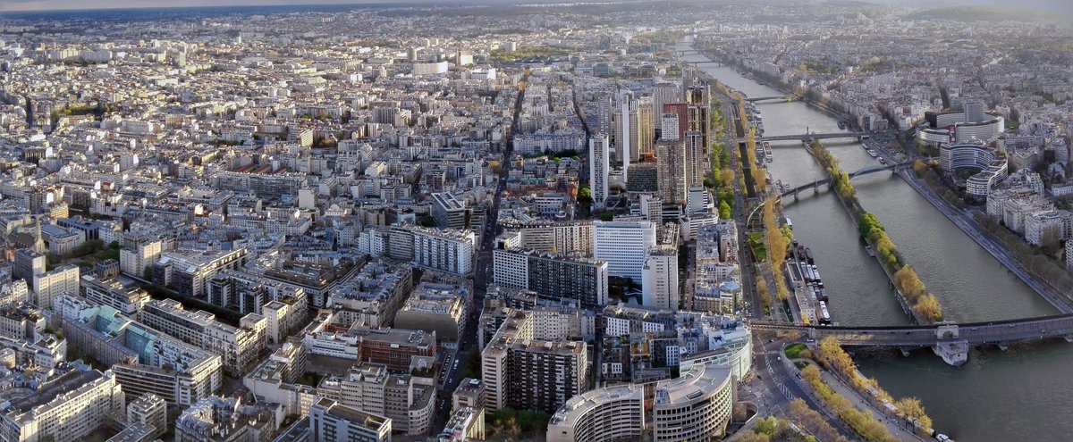 Paris. Panoramafoto von Paris mit Seine. Aufgenommen vom Eiffelturm am 14.04.2018.