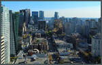 Die Robson Street ist eine beliebte Einkaufsstraße, welche die Downtown von Vancouver durchquert. Neben Hotels und modernen Hochhäusern gibt es hier auch kleinere Wohn- und Geschäftshäuser. Die Aufnahme entstand aus einem Hotel. (Vancouver, 15.10.2022)