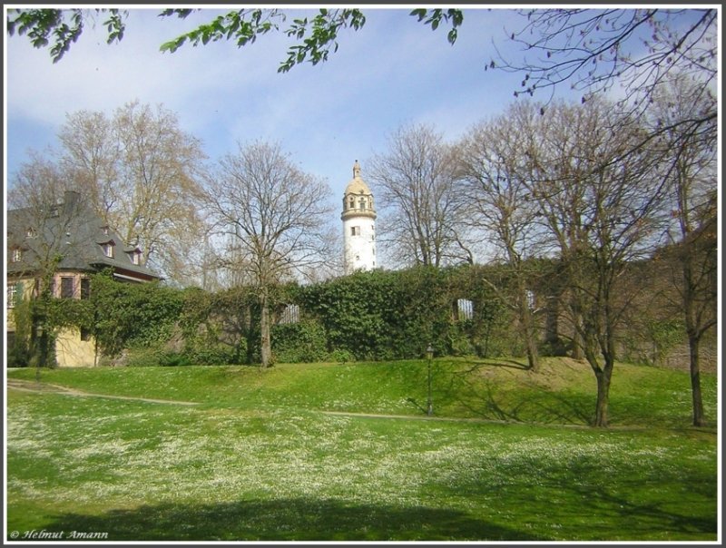 Frankfurt am Main-Höchst, Blick aus dem Brüningpark auf das Höchster Schloss. Das Gebäude im Bild entstand als Anbau im 19. Jahrhundert und wird seitdem als Neues Schloss bezeichnet, das sich baulich vom 1568 im Baustil der Renaissance erbauten Alten Schloss abhebt. Im Jahre 1908 erwarb die Familie Adolf von Brünings, einer der Gründer der Farbwerke Höchst, den verfallenden Gebäudekomplex, ließ ihn renovieren und öffnete den Park für die Öffentlichkeit. Helmut Amann