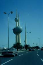 Blick aus einem fahrenden Auto auf die "Kuwait-Tower" im Februar 1986