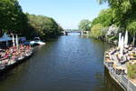 5.2021: auf der hohen Stele die Skulptur „Drei Männer im Boot“, 1952/53 erschaffen von Edwin Paul Scharff, in Erinnerung an drei Gefallene im Zweiten Weltkrieg, die auf einer Flakbatterie vor diesem Alsterufer eingesetzt waren.