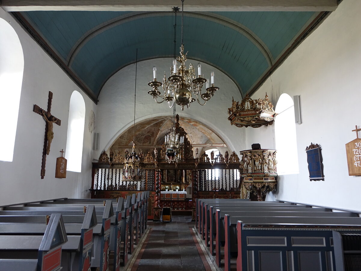 Øster Kippinge, Innenraum der evangelischen Kirche, Chorgitter von 1650 mit Skulpturen von Adam und Eva und Gemälden von Hans Lauridsen (18.07.2021)