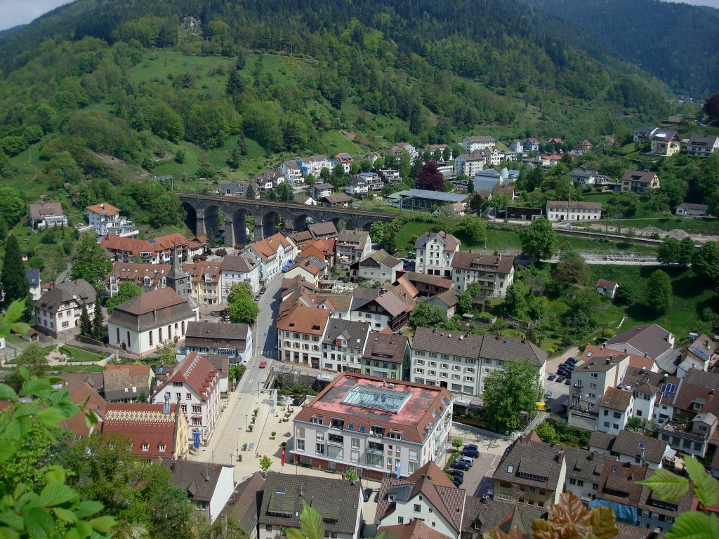 Hornberg im Schwarzwald, bekannt durch das "Hornberger Schießen", Blick von der Burg auf Stadt und Viadukt der Schwarzwaldbahn, Mai 2010
