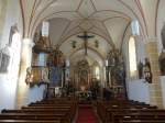 Pfarrkirche Maria Empfängnis, verputzte Saalkirche mit polygonalem Chorschluss und südlichem Chorflankenturm mit Steilsatteldach, Langhaus und Chor mit Stichkappentonnen, erbaut im 15. Jahrhundert (27.12.2015)