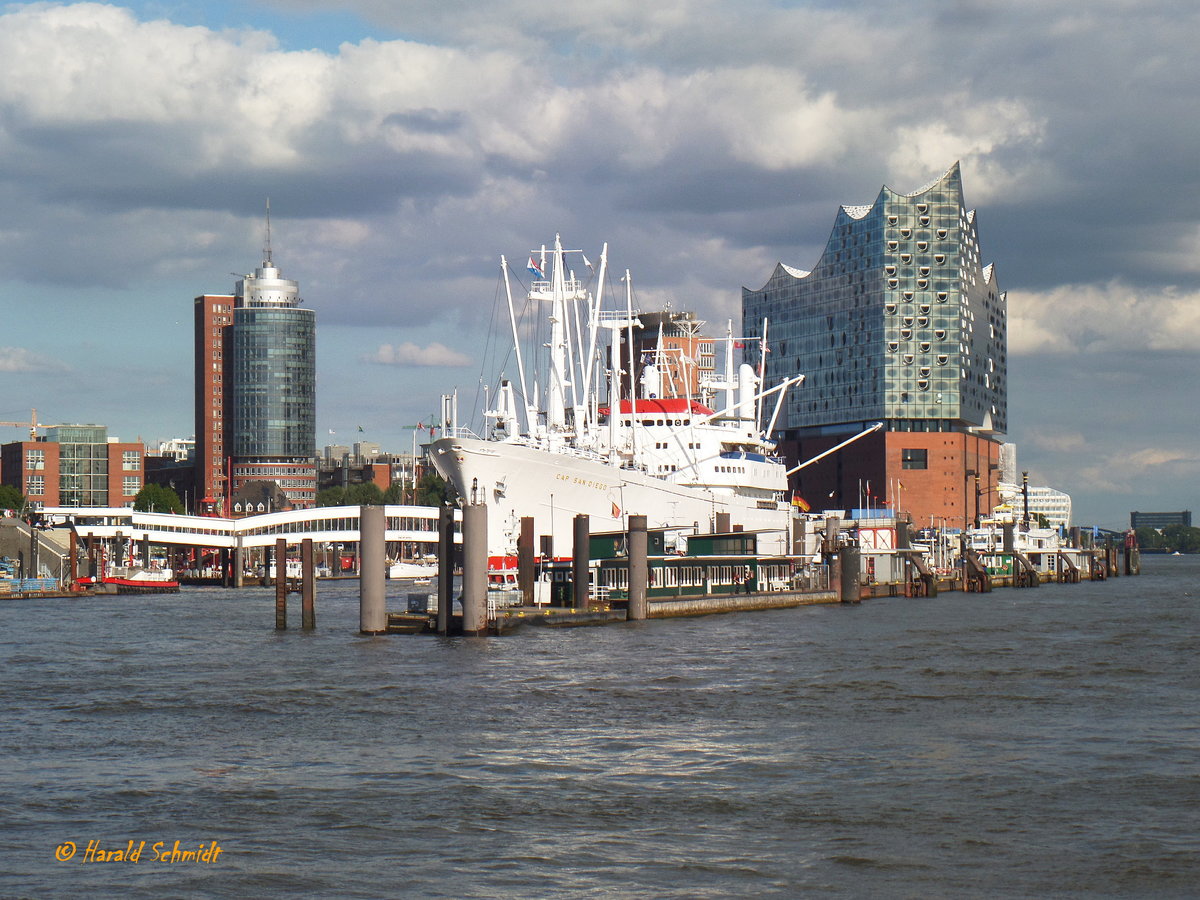 Hamburg am 3.5.2016: Panoramablick vom Baumwall (lks) über die Einmündung der Deichstraße, daneben das Haus der Seefahrt, weiter die Straße „Bei den Mühren“ über den Zollkanal mit der Brookstorbrücke und dann die Speicher an der Straße Brook im ehem. Freihafengebiet, fotografiert von der Kibbelstegbrücke / Harald Schmidt