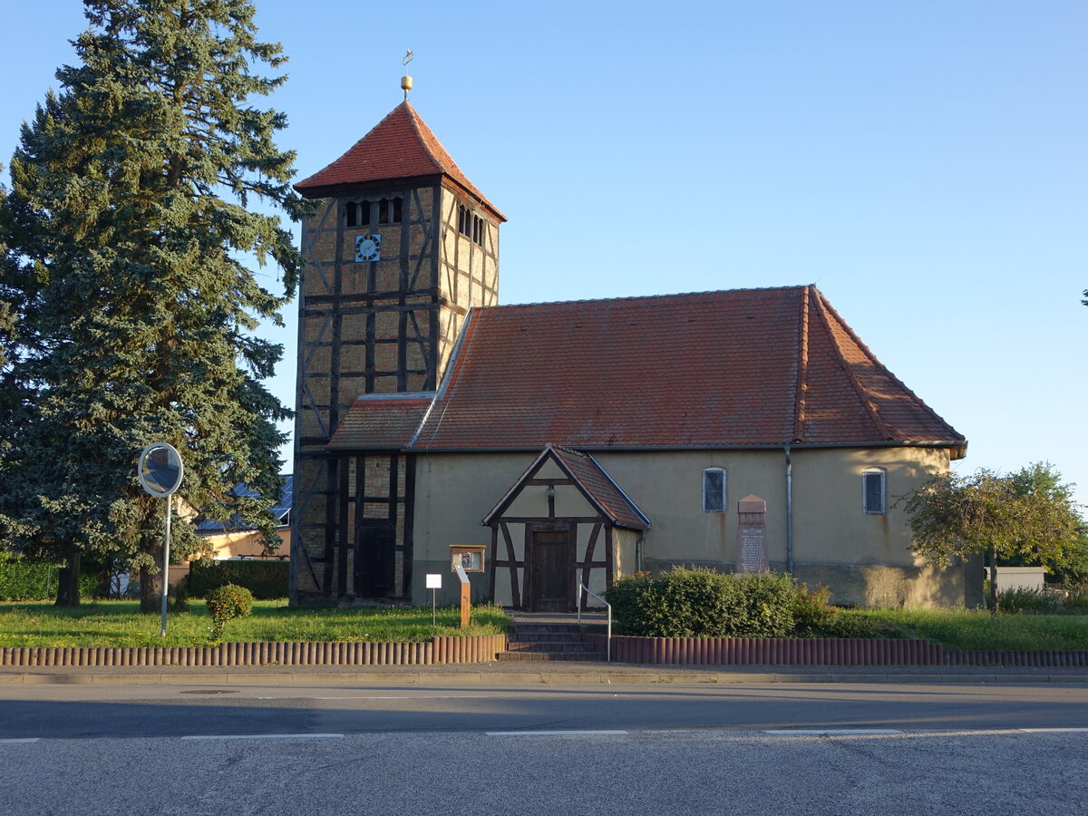 Jerchel, evangelische Kirche, kleine verputzte Saalkirche mit einem quadratischen Fachwerkturm, erbaut 1507 (11.08.2025)