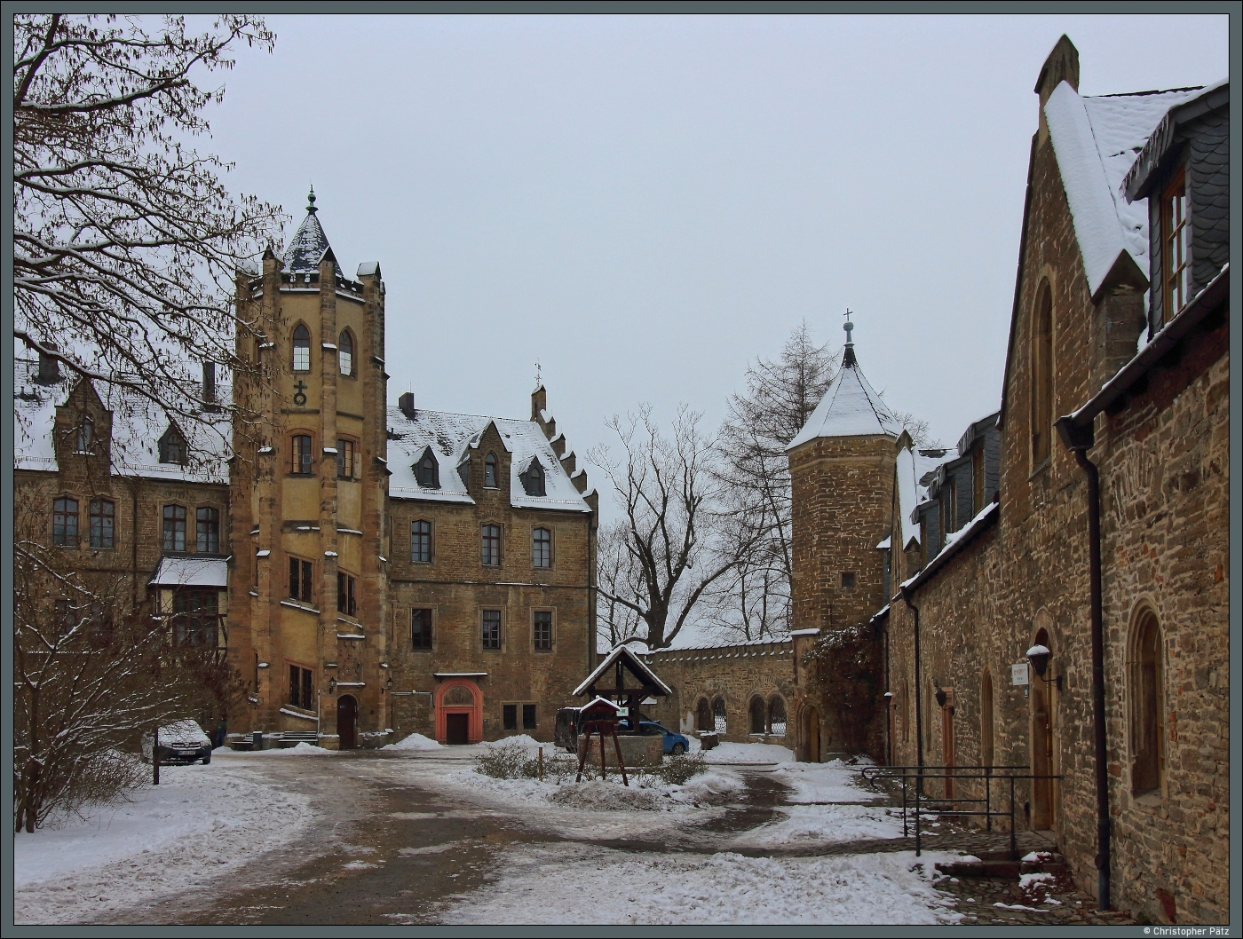 Der Innenhof des Schlosses Mansfeld wird dominiert vom Schloss Vorderort, das im 19. Jahrhundert im Neogotischen Stil umgebaut wurde. Rechts befindet sich das Bornstedtische Palais. (01.02.2026)