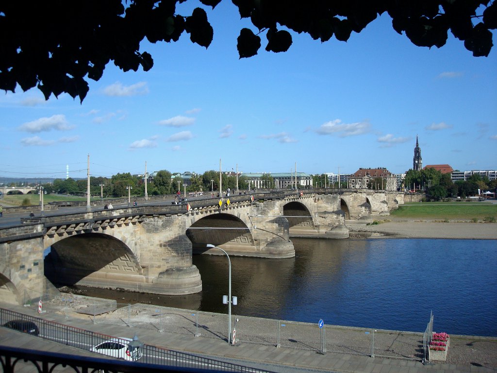 Dresden, Blick von der Bühlschen Terrasse auf die Elbe mit der Augustusbrücke, 1907-10 mit Stampfbeton und Sandsteinverkleidung erbaut, auf der anderen Seite Dresden-Neustadt, Okt.2009 rainer ullrich