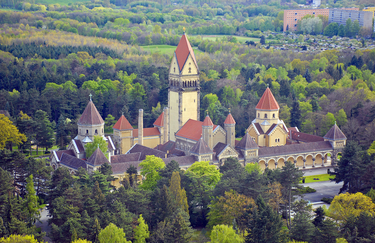 Die Kremationsanlage auf dem Südfriedhof Leipzig vom Völkerschlachtdenkmal aus gesehen. Aufnahme: 29. April 2017.
