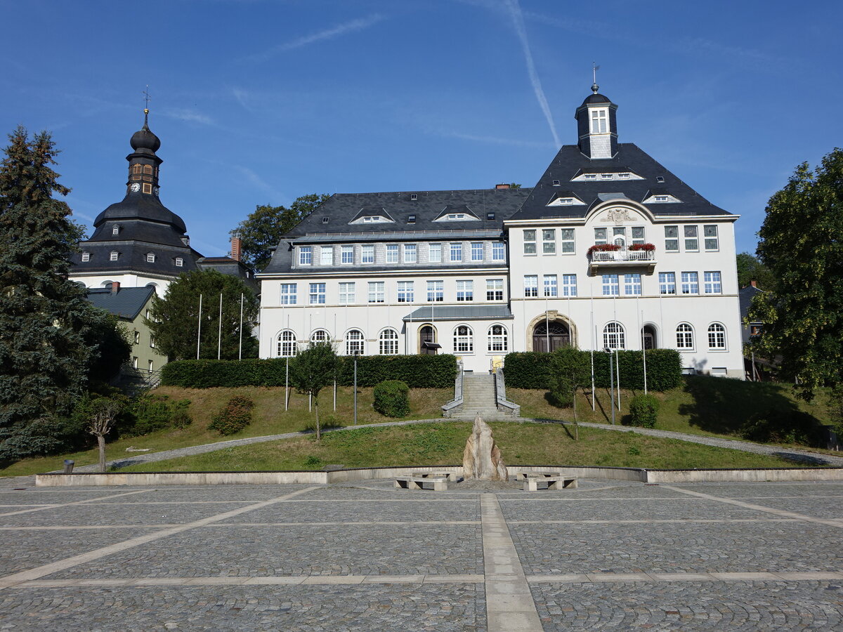 Klingenthal, Rathaus und Rundkirche Zum Friedefürst am Marktplatz (23.07.2023)