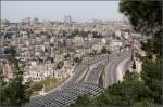 Jenseits der Jerusalemer Hügelkette - Blick vom Mount Scopus nach Osten in Richtung des Jordantales und dem Totem Meer. Der Fotostandpunkt befindet sich auf etwa 800 Meter über dem Meeresspiegel, das Tote Meer liegt über 400 Meter unter NN. Es geht bis dahin also etwa um 1200 Meter abwärts. Das Landschaftsbild ist ein anderes in dieser Richtung, sehr karg und wüstenähnlich. Hier sieht man das östlich Ende des Har HaTsofim Tunnel. Die neue Schnellstraße mündet weiter unten in die Route 1. 24.03.2014 (Matthias)
