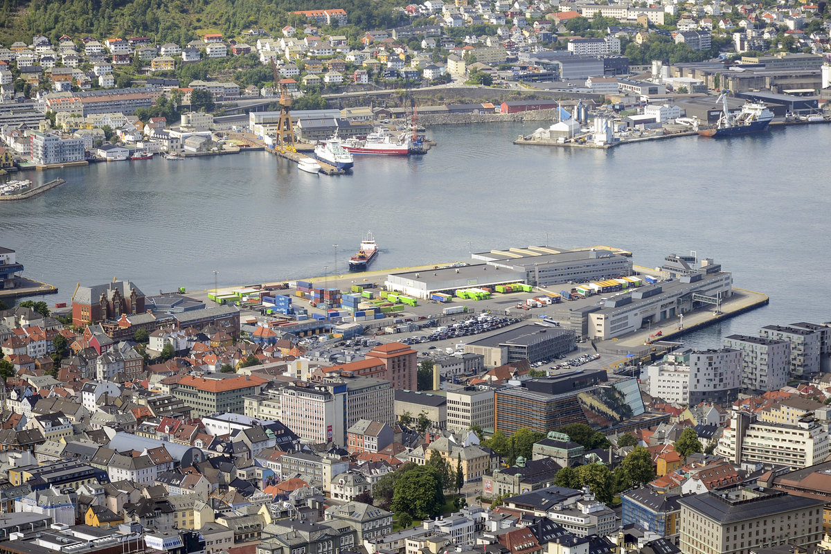 Blick auf Bergen von Fløyen. Der Hafen von Bergen ist einer der geschäftigsten Seehäfen Europas, von dem aus die Schiffe der Hurtigruten starten. Aufnahme: 11. Juli 2018. Hans Christian Davidsen