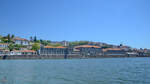 Blick über den Douro auf die Ruinen einer alten Fabrik, daran angegliedert das verlassene Herrenhaus Casa do Cais Novo in Porto.