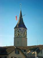 Zürich, Grossmünster, Doppelturm-Westfassade und südlicher Teil Langhaus mit Dachreiter, rechts davon Helmhaus. Nachtaufnahme im Mondschein, 13. Sept. 2011, 21:29 Heinz Stoll