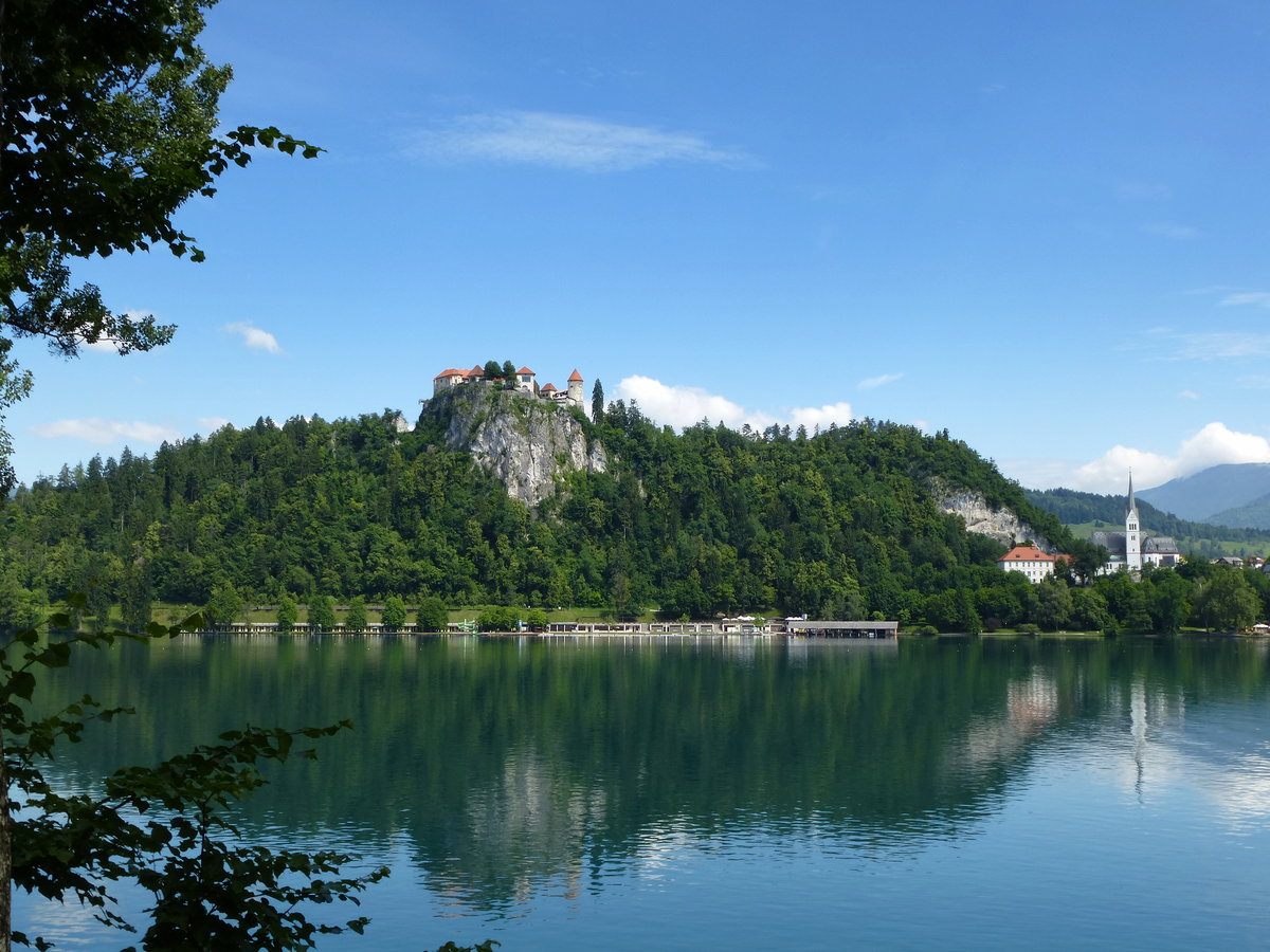 Bled (Veldes), Blick über den Bleder See zur Burg und Kirche St