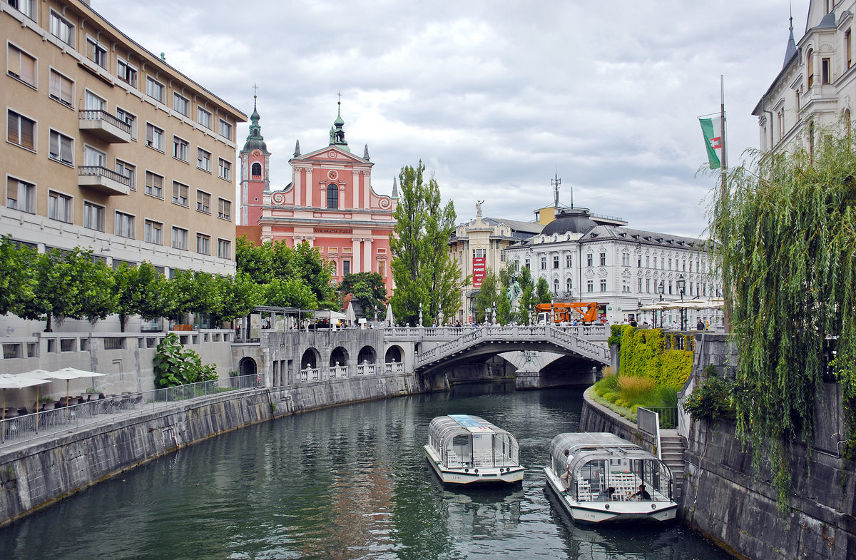 Der Fluss Sava in Ljubljana. Im Hintergrund ist die rote Mariä-Verkündigung-Kirche (Slowenisch: Cerkev Marijinega oznanjenja) zu sehen. Aufnahme: 1. August 2016. Hans Christian Davidsen