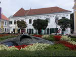 Székesfehérvár, Bischofspalast Püspöki Palota, erbaut von 1790 bis 1801 im Auftrag von Bischof janos Milassins, Architekt Jakob Rieder, davor Reichsapfelbrunnen von Bela Ohmann (27.08.2018)