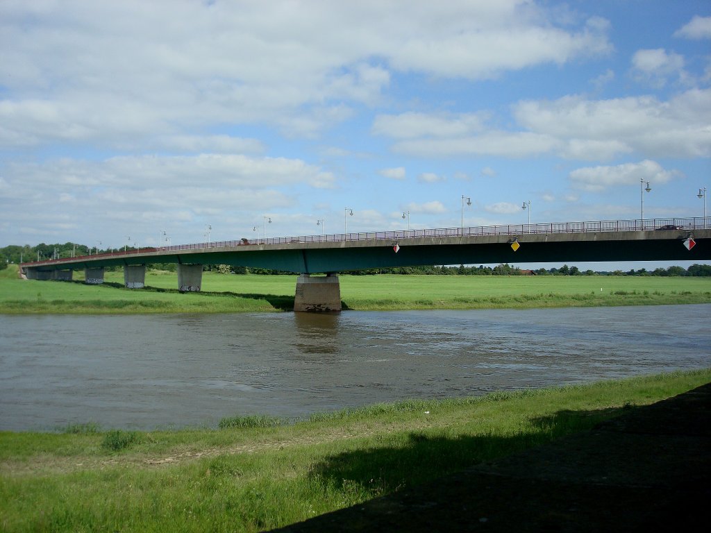 die Elbbrücke, eine Stahlverbundbrücke mit 509m Länge wurde 1991-93 erbaut, die alte Brücke ca.100m flußabwärts wurde 1994 abgerissen,