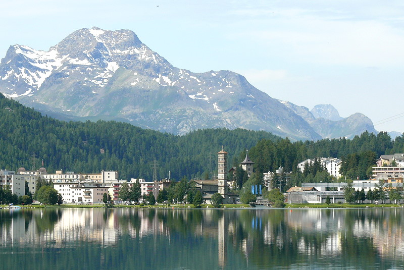 Blick am 21.07.2009 über St.Moritzer See auf den Schiefen Kirchen-Turm