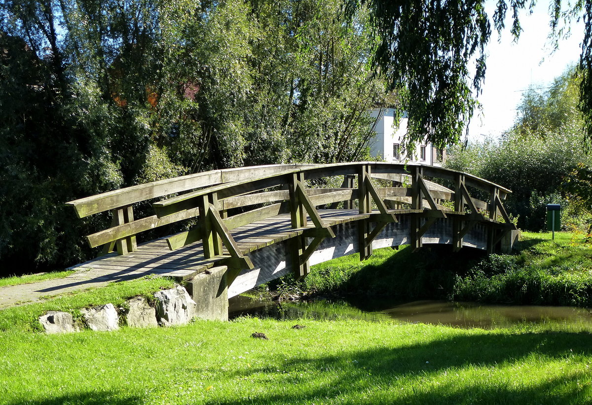 Eichstetten am Kaiserstuhl, hölzerne Bogenbrücke für Fußgänger und Radfahrer über den Mühlbach, Okt.2014