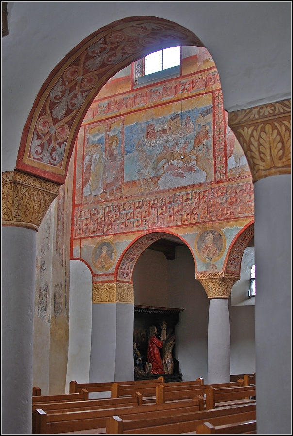 Surreales Mittelalter auf der Reichenau im südlichen Seitenschiff des Münsters St. Maria und Markus. Ohne zusätzliche Beleuchtung ist es fast ein Ding der Unmöglichkeit, dieses Bild festzuhalten. Es zeigt den Einzug von Pirmin auf die Insel Reichenau, während alles Ungetier schon vor dem Heiligen flüchtet (seltsam, dass alle sakralen Bauten schon fertig sind...). Konstanz im Osten ist schon durch die Sonne beleuchtet, während im Westen Richtung Stein am Rhein noch finsterste Nacht ist. April 2013.
