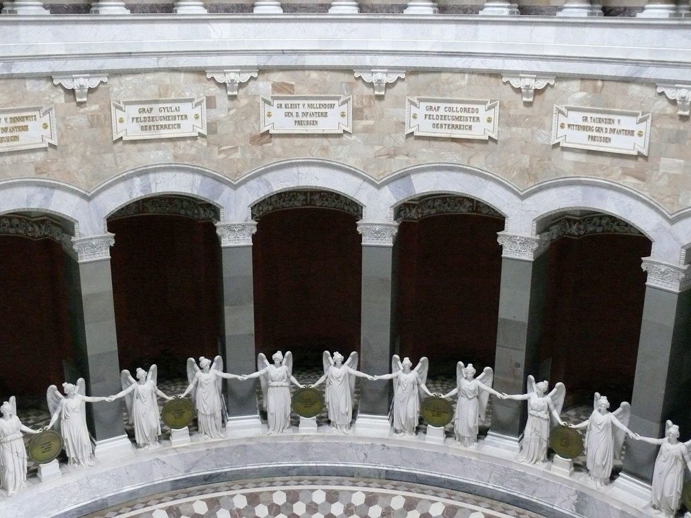 Im Inneren der Befreiungshalle stehen vor 18 Nischen insgesamt 34 Siegesgöttinnen (Viktorien) aus weißem Marmor, die sich die Hände reichen und somit einen feierlichen Reigen bilden (symbolisierend die Staaten des Deutschen Bundes), Über den Nischen befinden sich Tafeln mit den Namen bedeutender Feldherren; im Bild: Graf Gyulai Feldzeugmeister Österreich, Graf Kleist von Nollendorf General der Infanterie Preußen, Graf Colloredo Feldzeugmeister Österreich, Graf Tauenzien von Wittenberg General der Infanterie Preussen; Kelheim, 05.08.2010