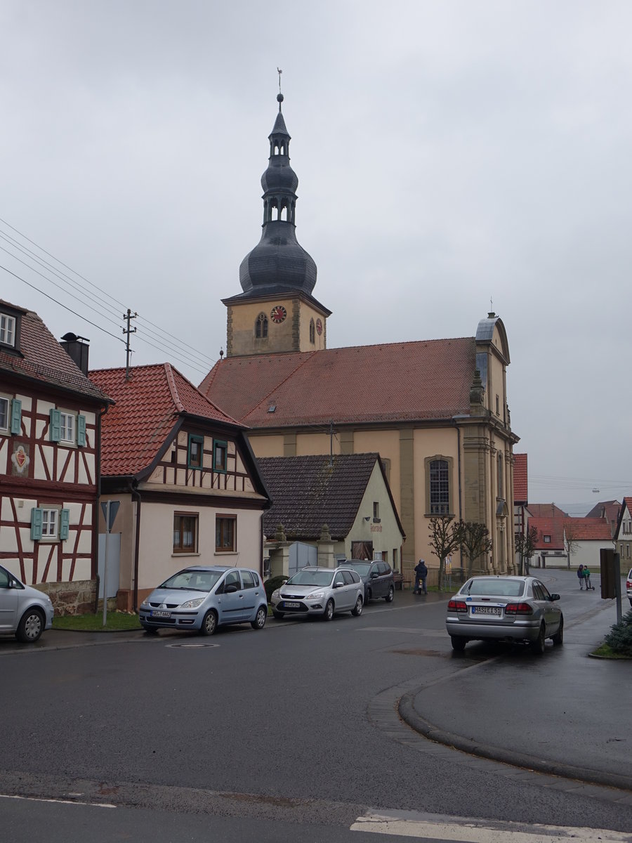 Ostheim, St. Nikolaus Kirche in der Marktstraße, Saalbau mit Volutengiebel, eingezogenem Chor und Flankenturm mit Zwiebelhaube und Laterne, Turm erbaut von 1678 bis 1679, Langhaus und Chor erbaut von 1725 bis 1726 (25.03.2016)