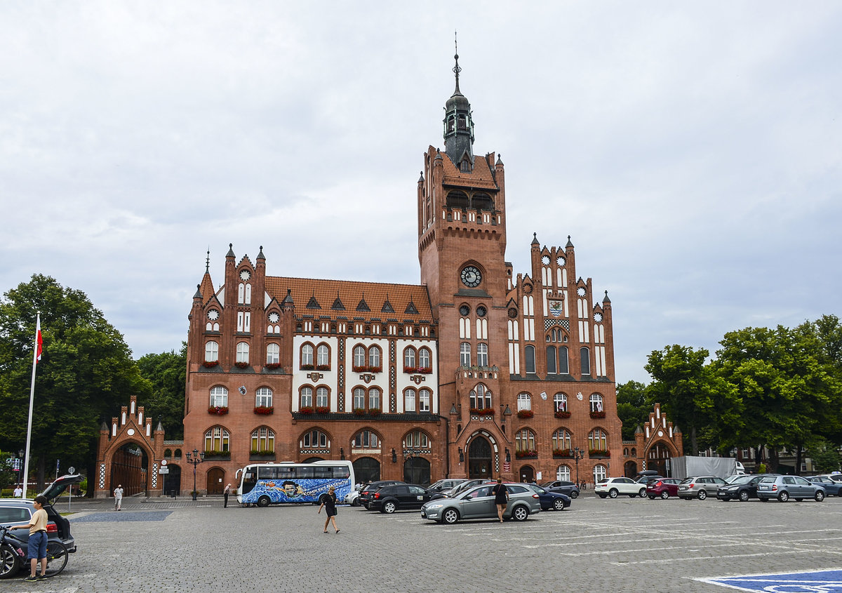 Die ehemalige Schlosskirche (Kościół św. Jacka) in Słupsk (Stolp) in Hinterpommern. Die Bausubstanz der Kirche, die den Zweiten Weltkrieg recht gut überstanden hat, stammt zum Teil aus dem 13. Jahrhundert. Sie war ursprünglich Gotteshaus des 1278 gegründeten Dominikanerklosters Aufnahme: 20. August 2020.