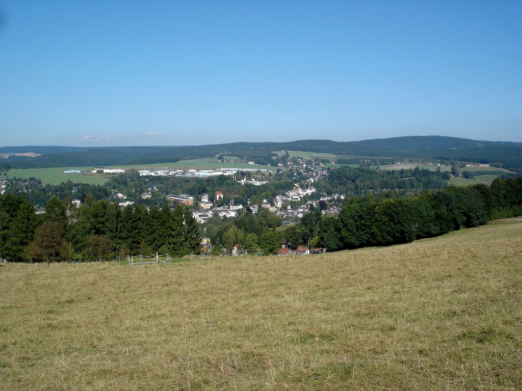Markneukirchen im Vogtland, Blick von der Bismarcksäule hoch über der Stadt, das 6500 Einwohner zählende Städchen ist ein Zentrum des Musikinstrumentenbaus, 2006