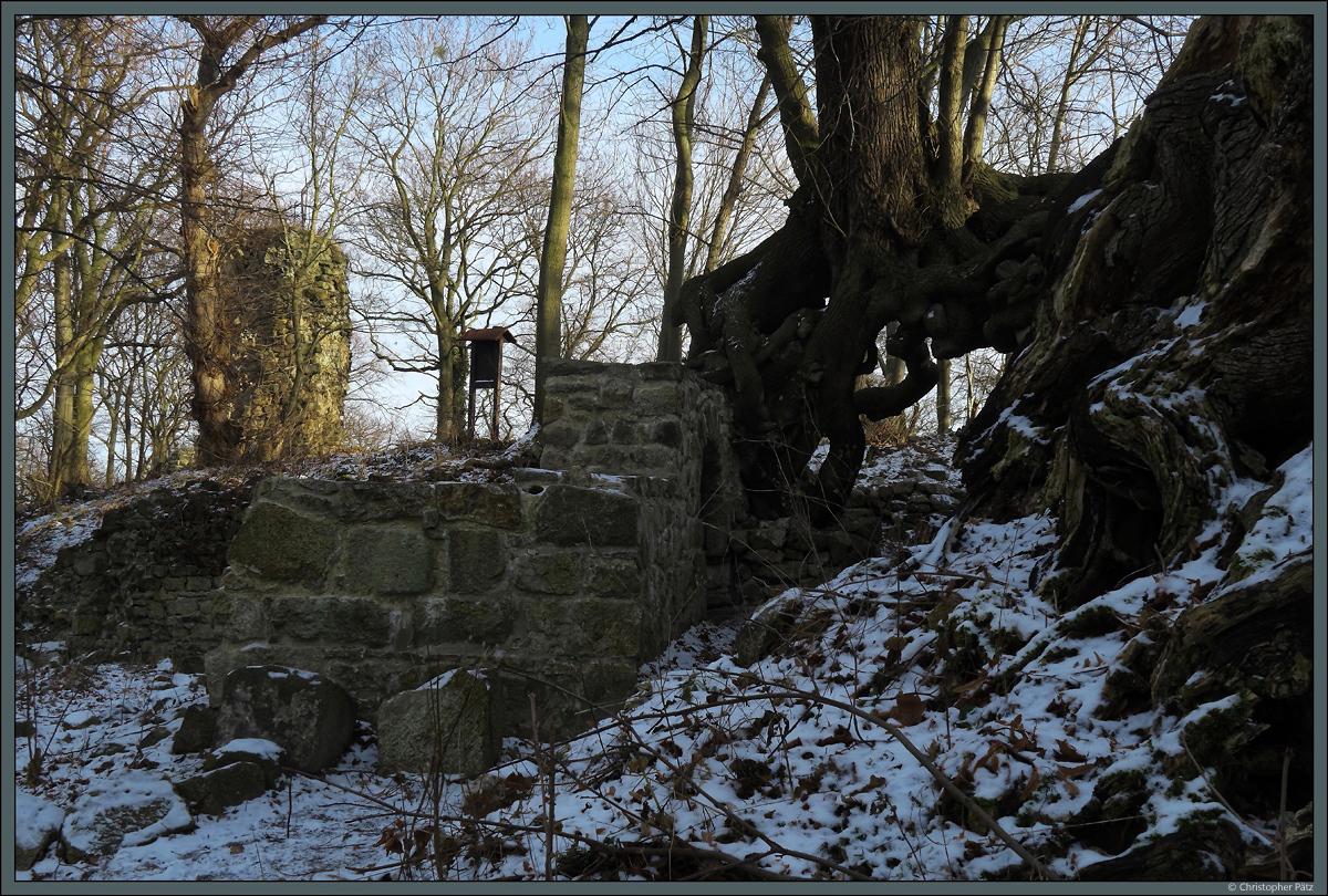 Das Zentrum der Burgruine Regenstein bildet der Rest des Bergfriedes. Davor befindet sich ein Graben, über den eine Brücke zum Haupttor der Burg führte, welche vom Bergfried aus leicht verteidigt werden konnte. Die in den weichen Sandstein gehauenen Treppenstufen sind noch gut zu erkennen. (bei Blankenburg, 02.10.2022) Christopher Pätz