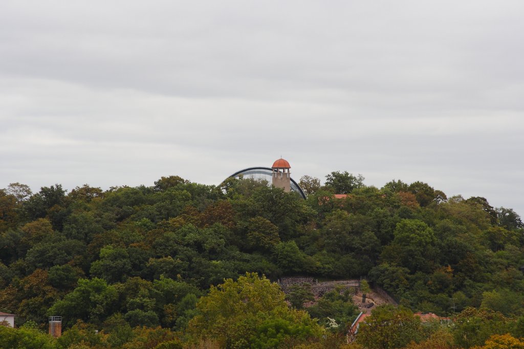 Blick von der Talstraße in Halle/Saale auf Burg Giebichenstein und die darunterliegenden Anlegestellen der Saale-Fahrgastschifffahrt am Rive-Ufer. Der große Holzkasten rechts, ebenso wie der im Bild nicht sichtbare links, sind Bauverschalungen und beinhalten zwei Großskulpturen (Kuh und Pferd), welche zurzeit aufwändig restauriert und voraussichtlich im Jahr 2014 fertiggestellt sein werden.