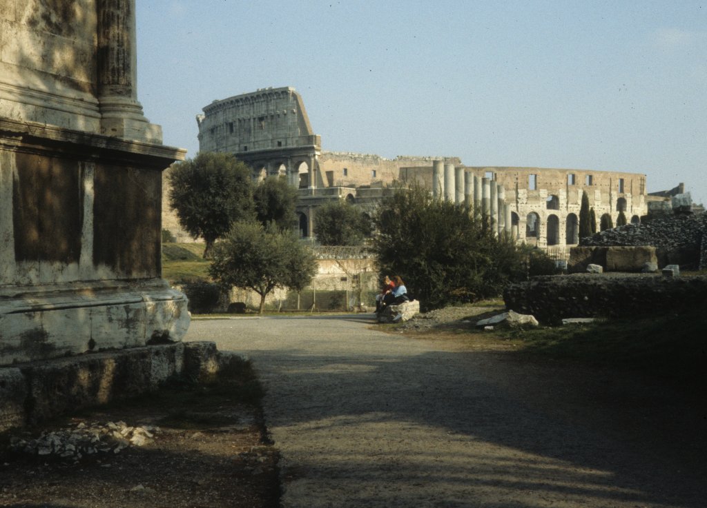 Roma / Rom 1989: Hinter den Ruinen des grössten Tempels in Rom, den Hadrian, Kaiser von 117 bis 138 n. Chr., für die Göttin Venus und die vergöttlichte Stadt Roma im Jahre 135 einweihen liess, sieht man das grösste Amphitheater, das schon in der Regierungszeit Vespasians vor der Vollendung eingeweiht wurde. Nachdem Vespasian 79 n. Chr. gestorben war, kam sein älterer Sohn Titus an die Macht. Er liess 80 n. Chr. das Amphiatheater zum zweiten Mal einweihen.