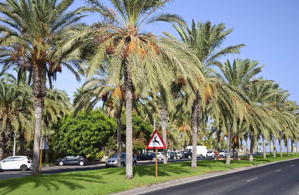Palmenallée Avenida del Saladar in Morro Jable auf der kanarischen Insel Fuerteventura. Aufnahme: 18. Oktober 2017.