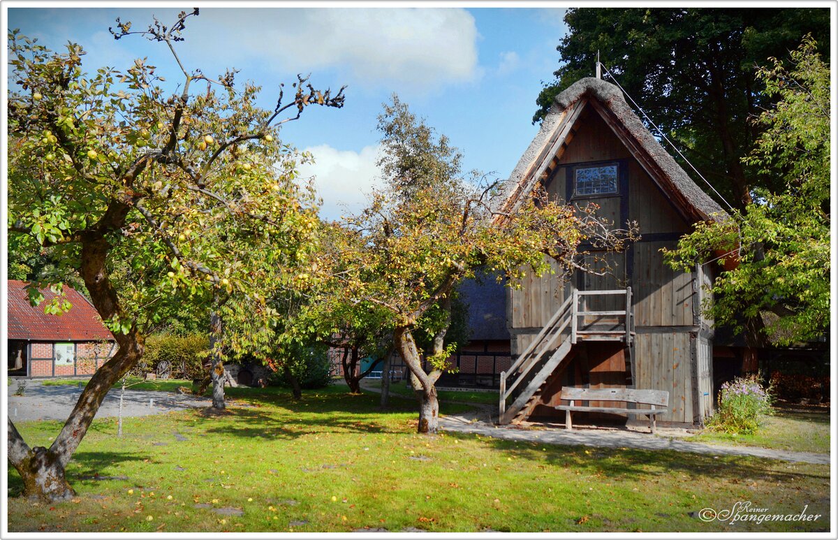 Treppenspeicher auf dem Heimathausgelände Rotenburg/Wümme. Tragende Apfelbäume im Vordergrund. Oktober 2025