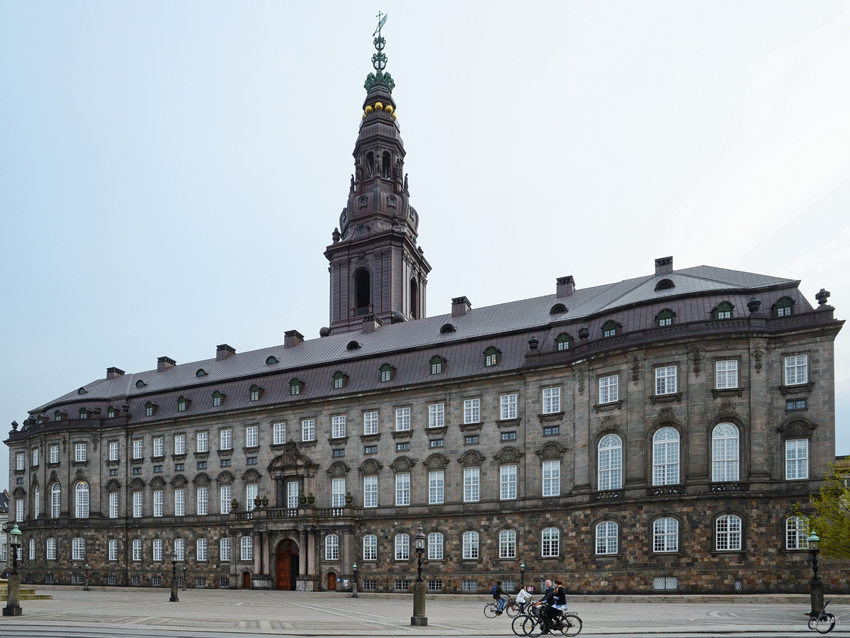 Im Bild der Turm des Schlosses Christiansborg in Kopenhagen, davor das Finanzministerium. Das Schloss ist weltweit der einzige Repräsentationsbau, der die höchsten Vertreter von Exekutive, Legislative und Judikative unter einem Dach vereint. (Mai 2012)