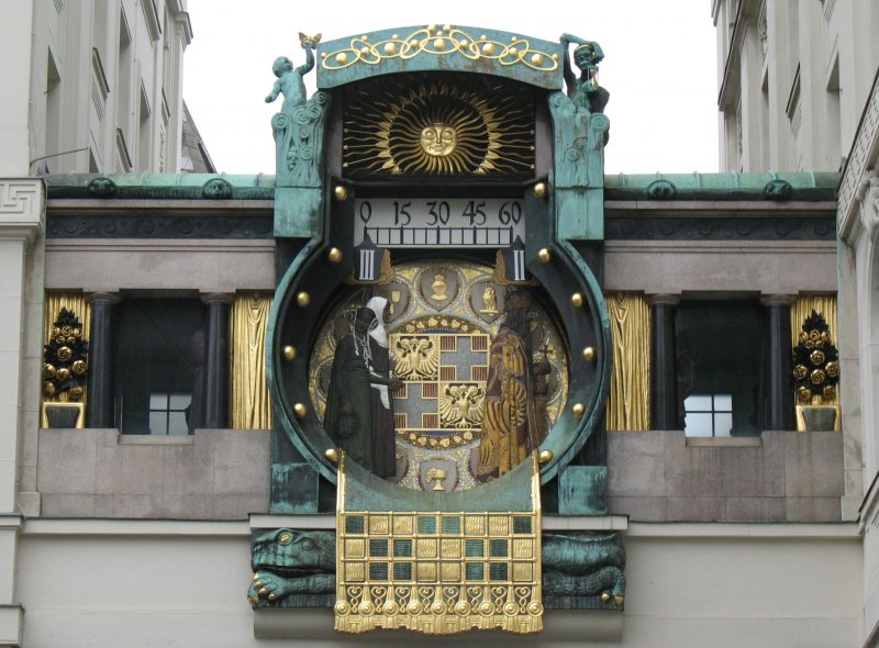 Die Ankeruhr in Wien: Zwölf Figurenpaare aus der Geschichte Wiens wandern innerhalb von zwölf Stunden am alten Stadtwappen vorbei.