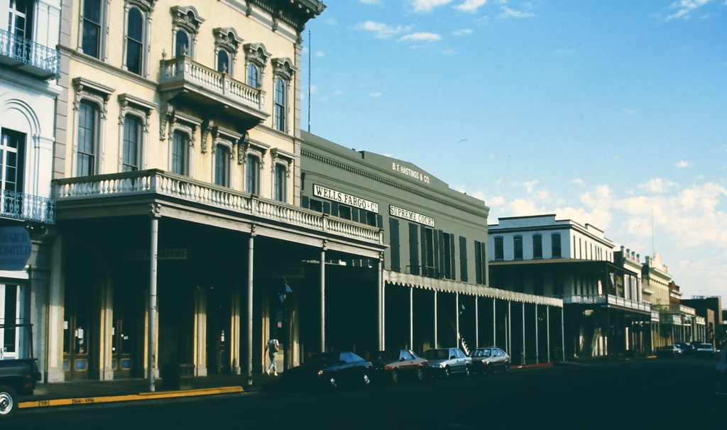 California Street, San Francisco, Blickrichtung Ost am 23. August 1988. Der Standpunkt der Aufnahme ist die Verkehrsinsel auf Bild 3893.