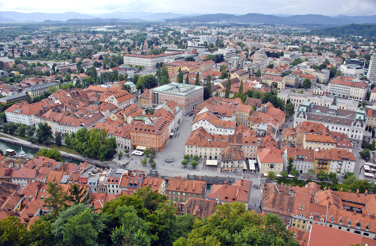 Freiburg, Blick von einer Restaurantterrasse über die Dächer der Altstadt zum Martinstor, Juni 2014