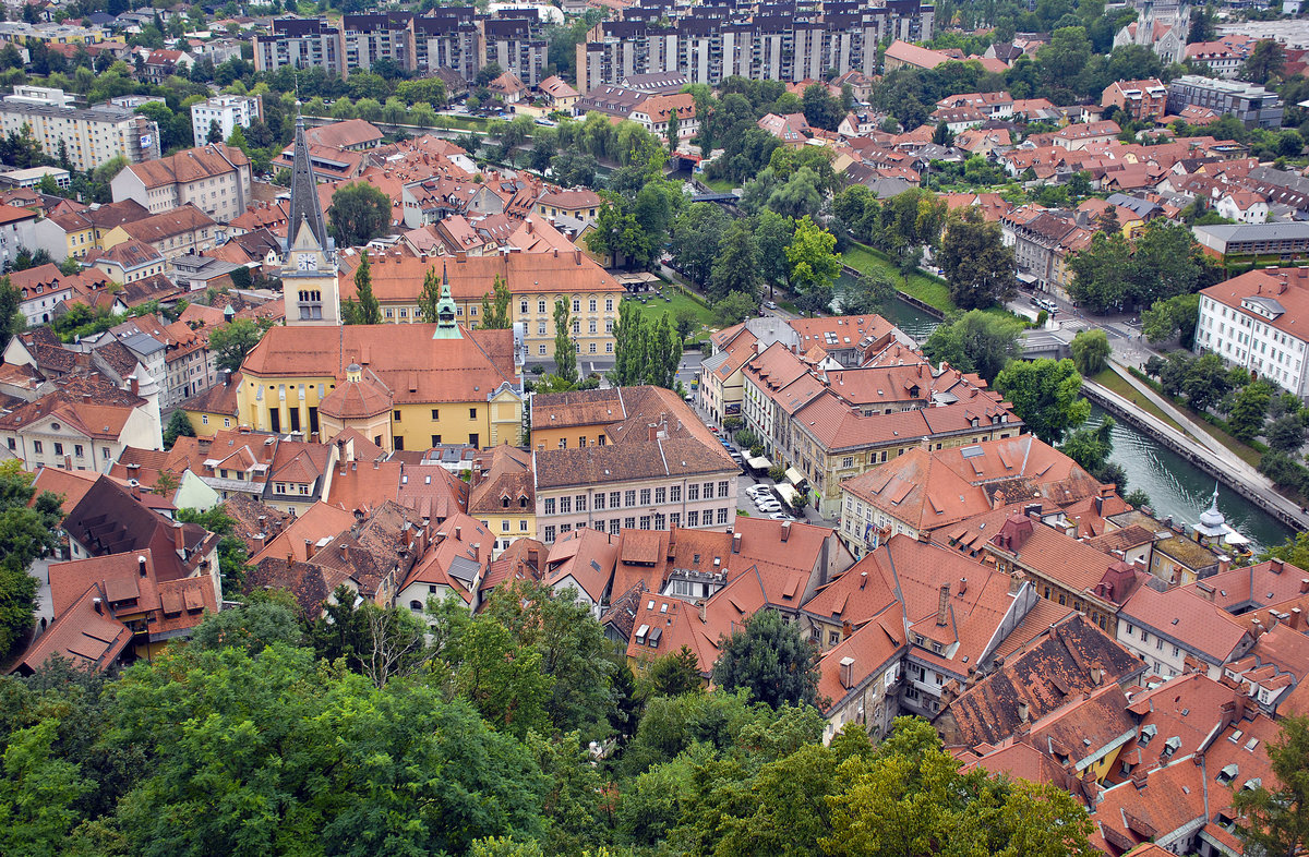 Die Cerkev sv. Jakoba-Kirche und der Viertel um Gornij trg von Ljubljanski Grad aus gesehen. Aufnahme: 1. August 2016.